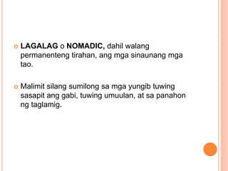 Sa pagkakaroon ng sentralisadong pamahalaan uring panlipunansining arkitektura at sistema ng pagsulatat masalimuot na relihiyon B. Paraan ng pamumuhay ng mga unang tao sa daigdig noong Panahong Paleolitiko. Mayroong mga pamantasan na siyang lugar kung saan itinuturo ang ibat ibang kasanayan 7.