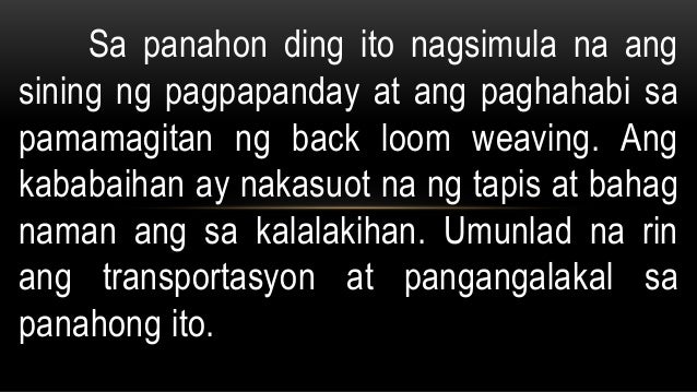 At may iilan na lamang na mga bahagi ng panitikan noong araw na naiwan at naitatak sa kultura ng ating. Ang Panahon ng Metal ay ang pangalan na ibinigay sa isa sa mga panahon kung saan nahahati ang Prehistory. 250BC sa Pilipinas ay nagsimula ang paggamit ng tanso bakal bronse at iba pang hiyas gaya ng kristal jade at ginto.